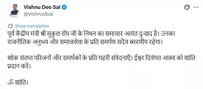 मुख्यमंत्री साय ने अपने संदेश में कहा कि पूर्व केंद्रीय मंत्री श्री मुकुल रॉय जी के निधन का समाचार अत्यंत दुखद है। उन्होंने आगे लिखा कि रॉय का लंबा राजनीतिक अनुभव और समाजसेवा के प्रति उनका अटूट समर्पण सदैव स्मरणीय रहेगा।