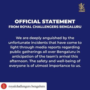 फ्रेंचाइजी ने अपने बयान में कहा, “हम इस दुखद घटना से बेहद दुखी हैं। हमारी पूरी टीम पीड़ित परिवारों के साथ खड़ी है और उन्हें हर संभव सहायता प्रदान करेगी।”