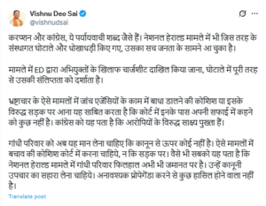 मुख्यमंत्री विष्णु देव साय ने सोशल मीडिया पर पोस्ट कर कांग्रेस पर प्रहार किया. उन्होने लिखा कि नेशनल हेराल्ड मामले में भी जिस तरह के संस्थागत घोटाले और धोखाधड़ी किए गए.