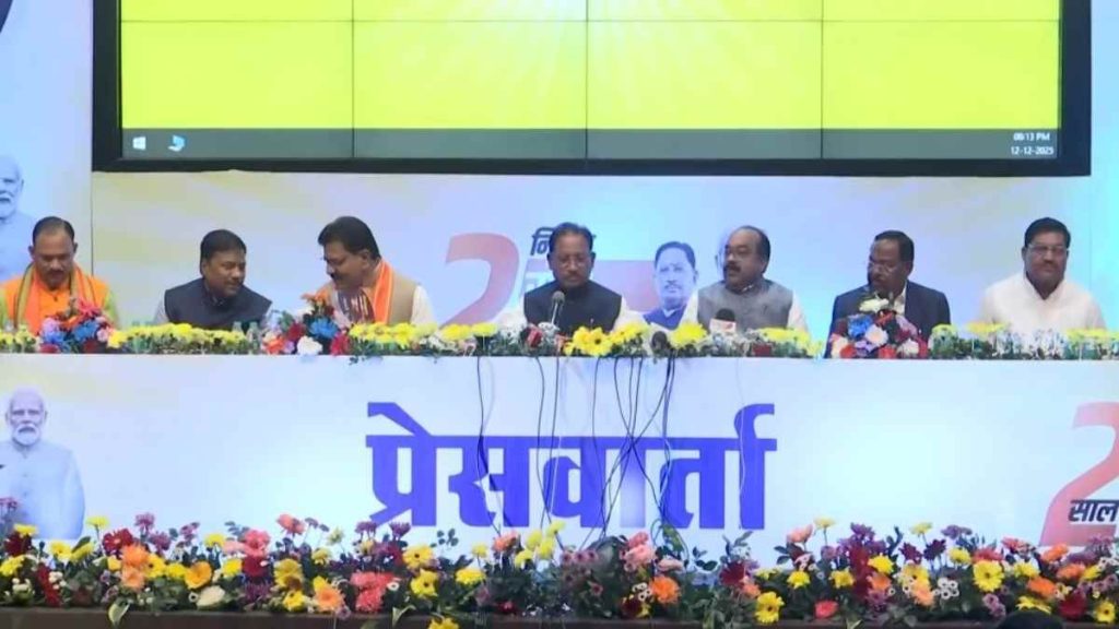 प्रेसवार्ता में डिप्टी सीएम अरुण साव, डिप्टी सीएम विजय शर्मा, मंत्री केदार कश्यप, खाद्य मंत्री दयाल दास बघेल, महिला एवं बाल विकास मंत्री लक्ष्मी राजवाड़े, स्वास्थ्य मंत्री श्याम बिहारी जायसवाल, कृषि मंत्री रामविचार नेताम सहित कई वरिष्ठ मंत्री उपस्थित रहे।