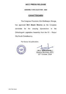 रायपुर: छत्तीसगढ़ में दक्षिण विधानसभा उप चुनाव के लिए कांग्रेस पार्टी ने अपने प्रत्याशी की घोषणा कर दी है। युवा नेता आकाश शर्मा को इस चुनाव में कांग्रेस का प्रतिनिधित्व करने के लिए टिकट दिया गया है।