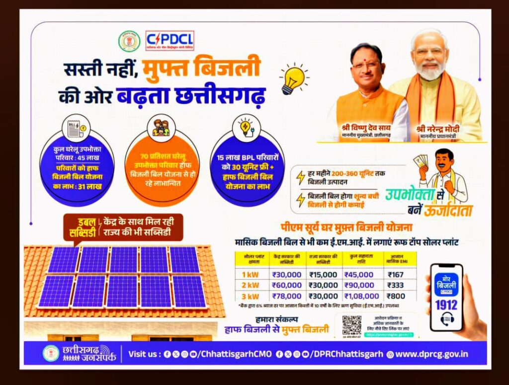 प्रधानमंत्री सूर्यघर योजना उपभोक्ताओं को सस्ती बिजली, स्थायी बचत और ऊर्जा आत्मनिर्भरता की ओर प्रेरित करेगी। साथ ही, पर्यावरण के प्रति उत्तरदायित्व निभाने की दिशा में भी यह एक बड़ा कदम साबित होगा। इससे छत्तीसगढ़ के उपभोक्ता हॉफ बिजली बिल से मुफ्त बिजली बिल योजना की ओर स्वाभाविक रूप से अग्रसर होंगे। उपभोक्ता किसी भी योजना पर निर्भर न रहते हुए स्वयं अपनी छत पर ऊर्जा उत्पादन कर “उर्जादाता” बनेंगे। यह रणनीतिक पहल राज्य को स्वच्छ ऊर्जा, आर्थिक बचत और ऊर्जा स्वतंत्रता की दिशा में आगे बढ़ाएगी।