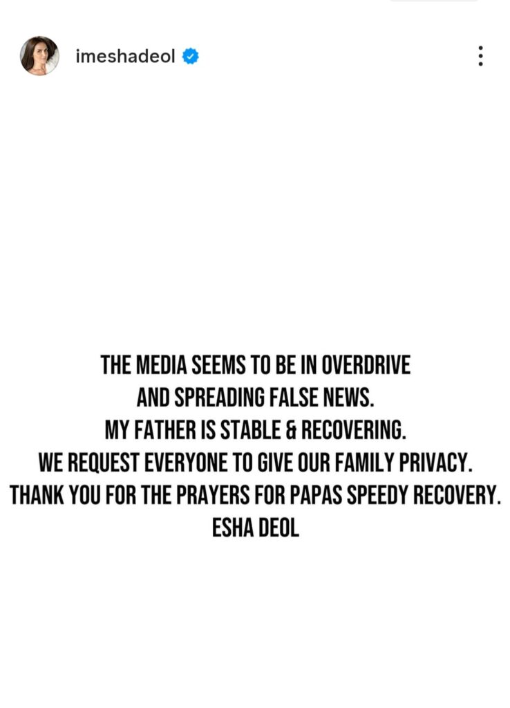 “मीडिया बहुत ज्यादा एक्टिव हो गया है और झूठी खबरें फैला रहा है। मेरे पिता की हालत स्थिर है और वे ठीक हो रहे हैं। आप सभी से निवेदन है कि हमारे परिवार को थोड़ी प्राइवेसी दें। पापा के जल्दी स्वस्थ होने के लिए दुआ करने वाले सभी का धन्यवाद।”
