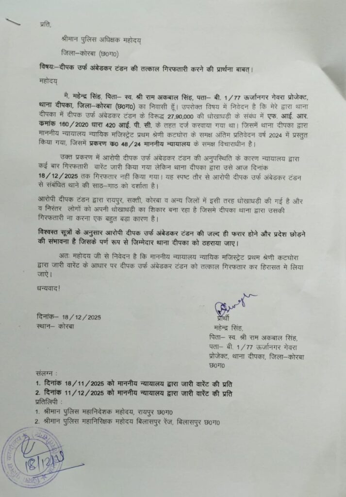 कोरबा। जिले में करीब 27 लाख 90 हजार रुपये की कथित धोखाधड़ी के मामले में आरोपी की गिरफ्तारी न होने से पुलिस की कार्यप्रणाली पर गंभीर सवाल खड़े हो गए हैं। गेवरा प्रोजेक्ट ऊर्जानगर निवासी महेंद्र सिंह ने इस संबंध में पुलिस अधीक्षक, कोरबा को लिखित आवेदन देकर आरोपी दीपक उर्फ अंबेडकर टंडन की तत्काल गिरफ्तारी की मांग की है।