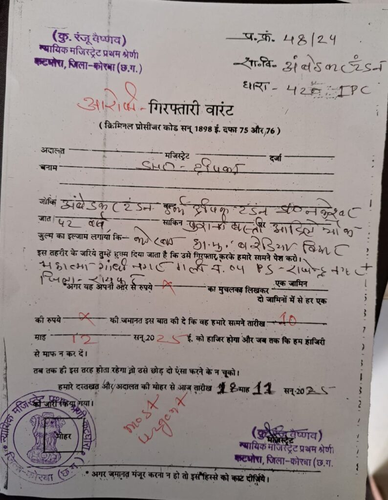 शिकायतकर्ता का आरोप है कि आरोपी लगातार न्यायालय में उपस्थित नहीं हो रहा है, जिसके चलते उसके खिलाफ कई बार गिरफ्तारी वारंट जारी किए गए, बावजूद इसके 18 दिसंबर 2025 तक उसकी गिरफ्तारी नहीं हो सकी। इससे थाना दीपका की लापरवाही या कथित साठ-गांठ की आशंका जताई जा रही है।