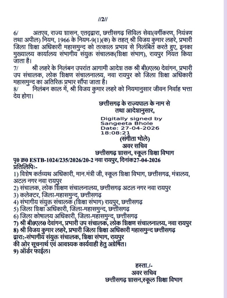 जिससे शासन एवं विभाग की छवि धूमिल हुई है। महासमुंद जिले में कार्यरत कर्मचारियों द्वारा माननीय उच्च न्यायालय बिलासपुर में दायर की गई याचिका डब्ल्यू.पी.एस. नं. 1745/2022 के संबंध में जिला शिक्षा अधिकारी महासमुंद को विभागीय आदेश क्रमांक ला/1064/2025 अटल नगर दिनांक 26.11.2025 के द्वारा प्रभारी अधिकारी नियुक्त किया गया था। प्रकरण में विजय कुमार लहरे, प्रभारी जिला शिक्षा अधिकारी महासमुंद मह द्वारा त्वरित कार्यवाही नहीं किया गया। इस संबंध में संचालनालय के विधि शाखा प्रभारी द्वारा भी दिनांक 03.12.2025 को उन्हे व्यक्तिगत व्हॉट्सऐप के माध्यम से अवगत कराया गया था। जिसे भी अनदेखा कर आदेश की अवहेलना करते हुए उक्त प्रकरण में माननीय उच्च न्यायालय में अपील दायर नहीं किया गया। श्री लहरे ने अपने पदीय दायित्वों एवं कर्तव्यों के प्रति सजगता से कार्य नहीं करते हुए स्वेच्छाचारिता मनमाना व्यवहार किया है। संचालनालय के आदेश क्रमांक/139/आडिट/14/2025-26 दिनांक 30.01.2026 के माध्यम से कार्यालय जिला शिक्षा अधिकारी जिला महासमुंद के विभागीय लेखाओं का अंकेक्षण कराया गया। अंकेक्षण प्रतिवेदन के अनुसार विजय कुमार लहरे, प्रभारी जिला शिक्षा अधिकारी महासमुंद के कार्यकाल के दौरान विभागीय लेखाओं के अंकेक्षण में गंभीर अनियमितता पायी गई है। विजय कुमार लहरे, जिला शिक्षा अधिकारी, महासमुन्द द्वारा अपने पदीय दायित्वों के निर्वहन में लापरवाही, स्वेच्छाचारिता एवं अनुशासनहीनता की गई है। श्री लहरे का उक्त कृत्य छ.ग. सिविल सेवा (आचरण) नियम, 1965 के नियम-5/ 3 के विपरीत गंभीर कदाचार है।अतःराज्य शासन, एतद्वारा, छत्तीसगढ़ सिविल सेवा (वर्गीकरण, नियंत्रण तथा अपील) नियम, 1966 के नियम-9 (1) (क) के तहत् विजय कुमार लहरे, प्रभारी जिला शिक्षा अधिकारी महासमुन्द को तत्काल प्रभाव से निलंबित करते हुए, इनका मुख्यालय कार्यालय संभागीय संयुक्त संचालक (शिक्षा संभाग), रायपुर स्थांतरित किया गया है तथा निलंबित श्री लहरे के निलंबन उपरांत आगामी आदेश तक बी०एल० देवांगन, प्रभारी उप संचालक, लोक शिक्षण संचालनालय, नवा रायपुर को को जिला जिला शिक्षा अधिकारी महासमुन्द का अतिरिक्त प्रभार सौंपा गया है।