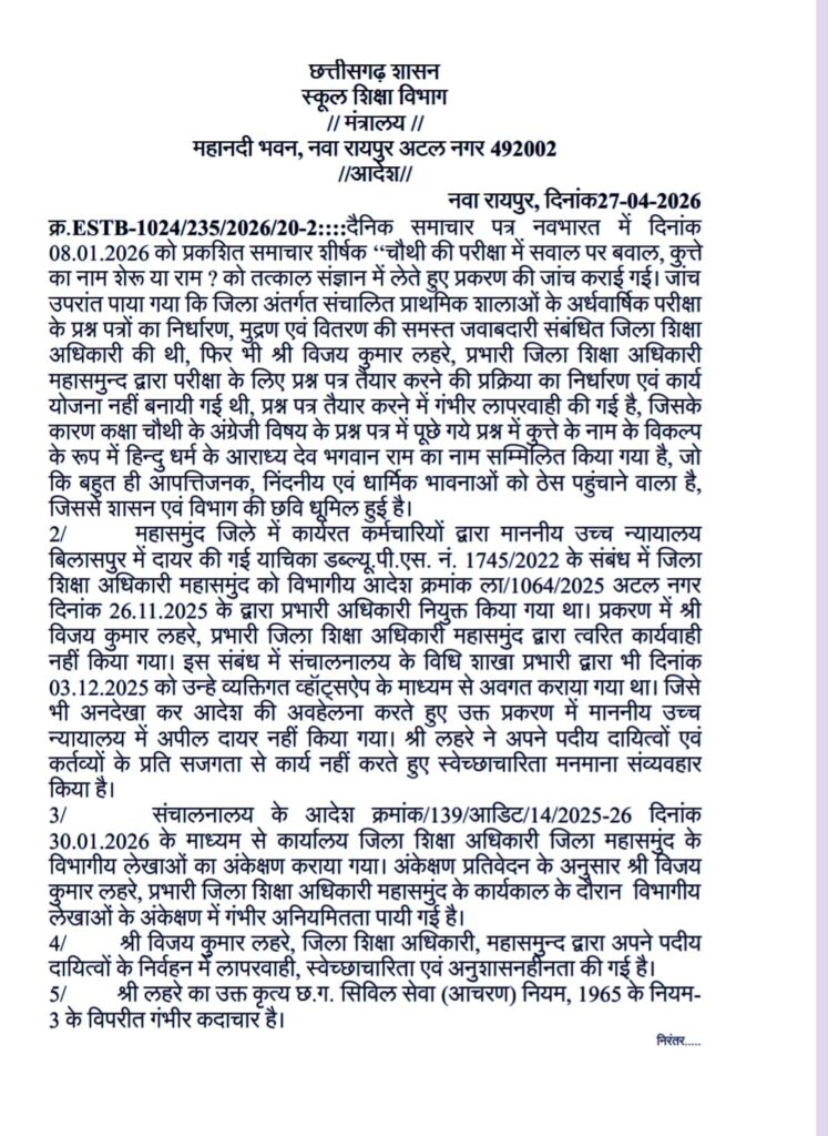 आज इस संबंध में स्कूल शिक्षा विभाग द्वारा जारी आदेश में कहा गया है कि “चौथी की परीक्षा में सवाल पर बवाल, कुत्ते का नाम शेरू या राम ? को तत्काल संज्ञान में लेते हुए प्रकरण की जांच कराई गई। जांच उपरांत पाया गया कि जिला अंतर्गत संचालित प्राथमिक प्राथमिक शालाओं के अर्धवार्षिक परीक्षा के प्रश्न पत्रों का निर्धारण, मुद्रण एवं वितरण की समस्त जवाबदारी संबंधित जिला शिक्षा अधिकारी की थी, फिर भी विजय कुमार लहरे, प्रभारी जिला शिक्षा अधिकारी महासमुन्द द्वारा परीक्षा के लिए प्रश्न पत्र तैयार करने की प्रक्रिया का निर्धारण एवं कार्य योजना नहीं बनायी गई थी, प्रश्न पत्र तैयार करने में गंभीर लापरवाही की गई है, जिसके कारण कक्षा चौथी के अंग्रेजी विषय के प्रश्न पत्र में पूछे गये प्रश्न में कुत्ते के नाम के विकल्प के रूप में हिन्दु धर्म के आराध्य देव भगवान राम का नाम सम्मिलित किया गया है, जो कि बहुत ही आपत्तिजनक, निंदनीय एवं धार्मिक भावनाओं को ठेस पहुंचाने वाला है