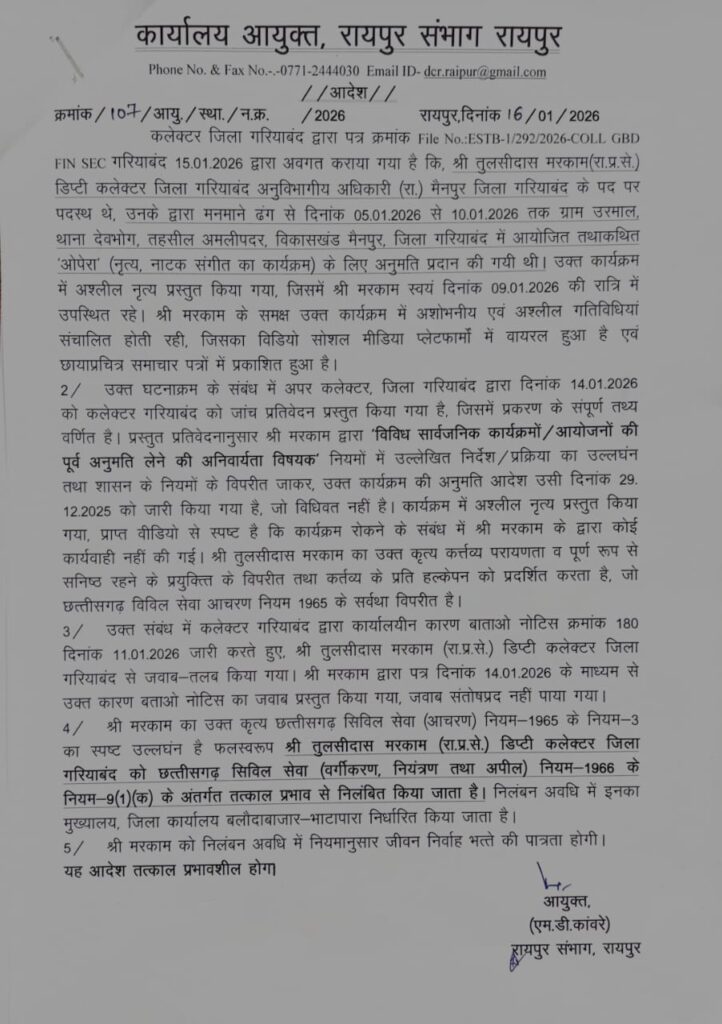 रायपुर/गरियाबंद: रमेश गुप्ता : छत्तीसगढ़ के गरियाबंद जिले में पदस्थ डिप्टी कलेक्टर तुलसीदास मरकाम को शासकीय सेवा नियमों के उल्लंघन और अशोभनीय आचरण के चलते तत्काल प्रभाव से निलंबित कर दिया गया है। उन पर आरोप है कि उन्होंने न केवल एक अश्लील कार्यक्रम की मनमाने ढंग से अनुमति दी, बल्कि स्वयं उस कार्यक्रम में मौजूद रहकर अश्लीलता को बढ़ावा दिया। रायपुर संभाग के आयुक्त एम.डी. कांवरे ने इस संबंध में आदेश जारी कर दिए हैं।
