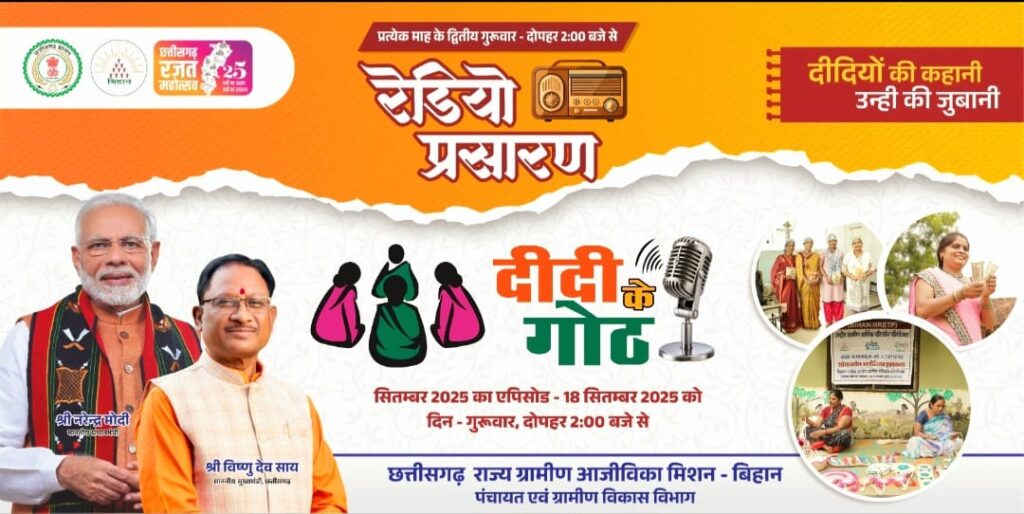 सितंबर माह का एपिसोड दिनांक 18 सितम्बर 2025 (गुरुवार) दोपहर 2:00 बजे से प्रसारित होगा। इस कार्यक्रम की विशेषता यह है कि इसमें स्व-सहायता समूह से जुड़ी दीदियां अपनी सफलता की कहानियां स्वयं अपनी जुबानी सुनाती हैं।