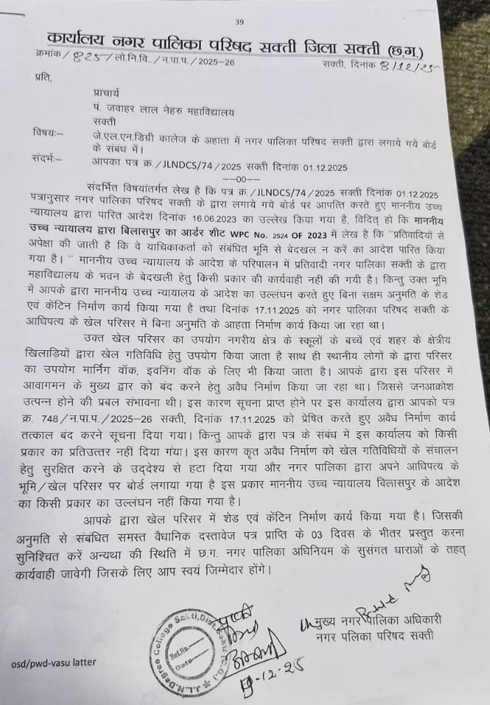 सक्ती – जेएलएन कॉलेज में नगर पालिका और महाविद्यालय प्रबंधन के बीच जमीन और निर्माण को लेकर चल रहा विवाद अब गंभीर होता दिख रहा है। नगर पालिका परिषद ने स्पष्ट चेतावनी दी है कि यदि कॉलेज प्रबंधन और प्राचार्य ने तीन दिनों के भीतर अपने निर्माण संबंधी दस्तावेज प्रस्तुत नहीं किए, तो उनके खिलाफ उच्च न्यायालय के आदेश की अवहेलना यानी Contempt of Court की कार्रवाई की जा सकती है।