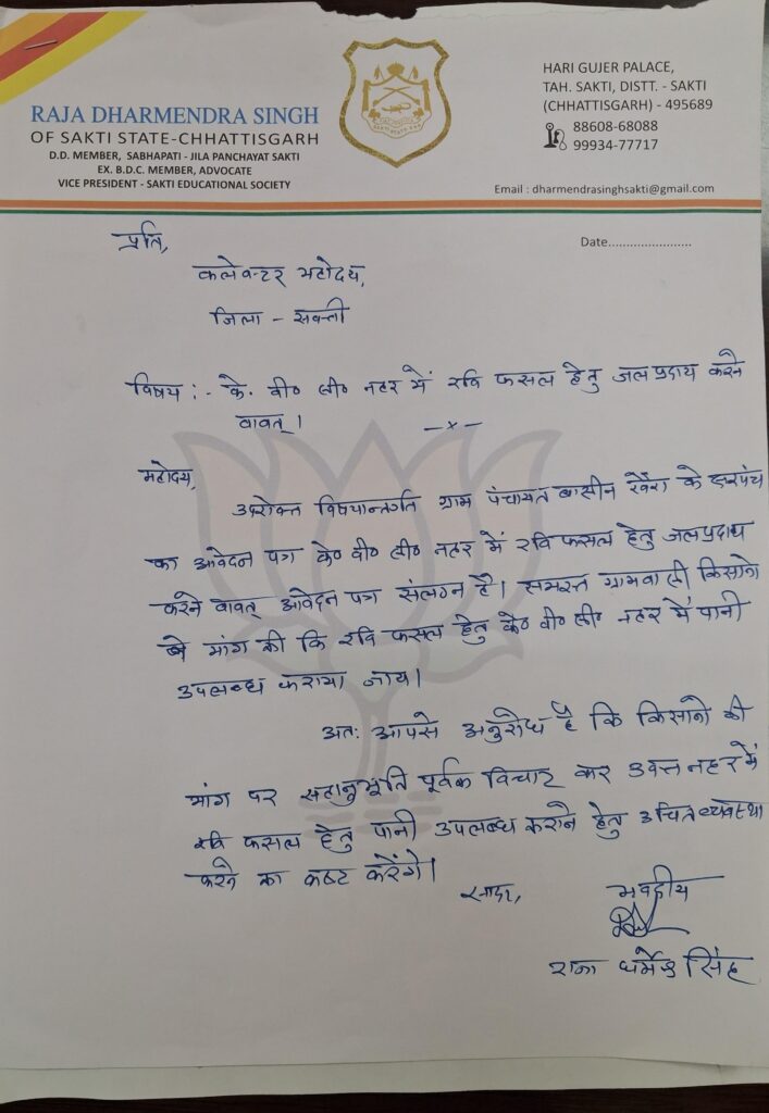 राजा धर्मेंद्र सिंह ने कलेक्टर से ग्रामीणों की मांग को अवगत कराया. उन्होने बताया कि ग्राम पंचायत बासीन खैरा के सरपंच समेत कई गांवों के लोगों की मांग है कि रबी फसल के लिए केवीसी नहर में पानी छोड़ा जाए. जिला पंचायत सभापति ने कहा कि प्रशासन अगर पानी छोड़ता है तो इससे हजारों किसानों को लाभ होगा.
