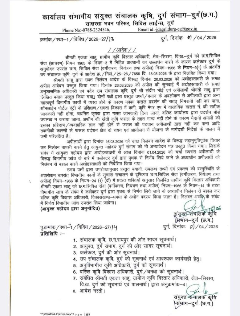 विभागीय जांच और प्रक्रिया के बाद अब एकता साहू के निलंबन को रद्द करने का आदेश जारी किया गया है। बहाली के पश्चात उन्हें विकासखंड धमधा के वरिष्ठ कृषि विस्तार अधिकारी कार्यालय में पदस्थ किया गया है। प्रशासन की इस कार्रवाई के बीच पुलिस और संबंधित विभाग अफीम तस्करी से जुड़े अन्य पहलुओं की जांच में जुटे हुए हैं।
