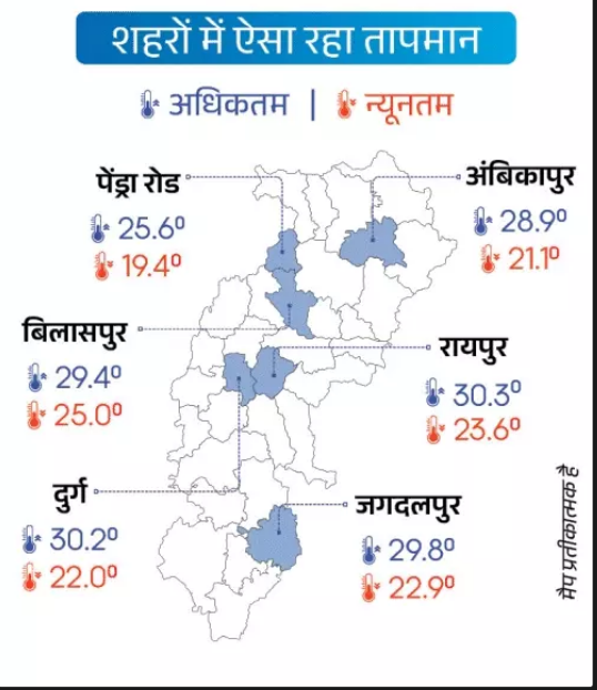 मौसम विभाग ने आज 8 जिलों में यलो अलर्ट जारी किया है, जिनमें सरगुजा, कोरिया, बलरामपुर, जशपुर और बिलासपुर शामिल हैं। कल यानी 31 अक्टूबर से मौसम के सामान्य होने की संभावना है। अब तक अक्टूबर में 59% अधिक बारिश रिकॉर्ड की गई है।