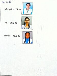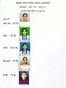 बारहवीं में आरती पटेल 77 प्रतिशत, हेमलता ७५ प्रतिशत, सन्ध्या कुमारी 73 प्रतिशत, हेमलता साहू 73 प्रतिशत, सुमित्रा कुमारी 71 प्रतिशत, हेमा 70 प्रतिशत, पूनम पटेल 70 प्रतिशत अंक हासिल किए हैं। इसी प्रकार दसवीं में आकांक्षा 82 प्रतिशत, सरस्वती 81 प्रतिशत, शीतल कुमारी ७८ प्रतिशत, मधु पटेल 73 प्रतिशत, सुहानी ७२ प्रतिशत, सुष्मिता 71 प्रतिशत, कुमकुम 70 प्रतिशत अंक हासिल कर स्कूल का नाम रोशन किये है।