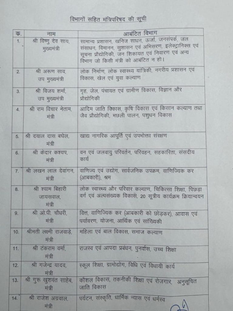 Exclusive: हो गया विभागों का बंटवारा.. देखे कौन सा मंत्रालय किसे मिला By Vatan Jaiswal Updated: Wed, 20 Aug, 2025 2:19 PM छत्तीसगढ़, टॉप 10, बस्तर, बिलासपुर, राज्य Follow on 20 Aug साय कैबिनेट के नए सदस्यों के शपथ ग्रहण के साथ ही उन्हें उनके विभागों की जवाबदारी भी सौंप दी गई है. देखें किस मंत्री को कौन सा विभाग दिया गया है.