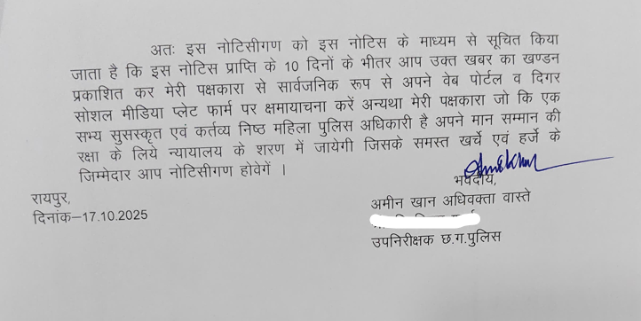 महिला पुलिस अधिकारी ने अपने वकील के माध्यम से उक्त महिला पत्रकार को नोटिस भेज कर माफी मांगने को कहा और 10 दिन के भीतर इस खबर का खंडन करने को कहा है. अगर वह महिला पत्रकार ऐसा नही करेगी तो महिला पुलिस अधिकारी इस मामले को कोर्ट में ले जाएगी.
