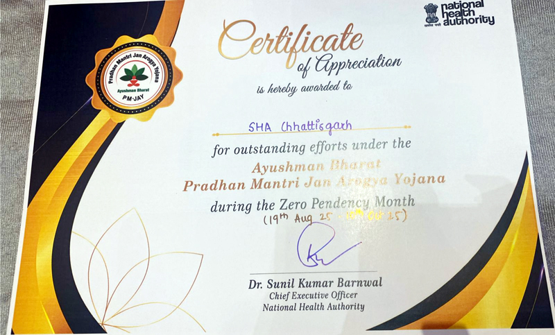 यह सम्मान राज्य के अथक प्रयासों और स्वास्थ्य क्षेत्र में अनुकरणीय कार्यशैली का प्रमाण है। सम्मान देने के मुख्य कारण पहचान किए गए सभी मुद्दों पर गहन फील्ड ऑडिट का सफलतापूर्वक आयोजन किया गया। आयुष्मान योजना के दावा प्रक्रिया में टर्नअराउंड टाइम को उल्लेखनीय रूप से घटाया गया, जिससे लाभार्थियों को त्वरित सेवाएं मिलीं। सभी संबंधित हितधारकों की विस्तृत संवेदनशीलता और जागरूकता कार्यक्रमों का संचालन कर उन्हें जागरूक बनाया गया। एनएचए की पैनल्ड स्वास्थ्य सेवा प्रदाताओं के साथ प्रभावी संचार तंत्र स्थापित कर समन्वय को बेहतर किया गया। छत्तीसगढ़ सरकार का यह प्रयास राज्य के नागरिकों को गुणवत्तापूर्ण और सुलभ स्वास्थ्य सेवाएं उपलब्ध कराने में मील का पत्थर साबित हुआ है। मुख्यमंत्री श्री साय ने छत्तीसगढ़ की इस उपलब्धि के लिए स्वास्थ्य विभाग के सभी अधिकारियों एवं स्वास्थ्य कार्यकर्ताओं को बधाई दी है।