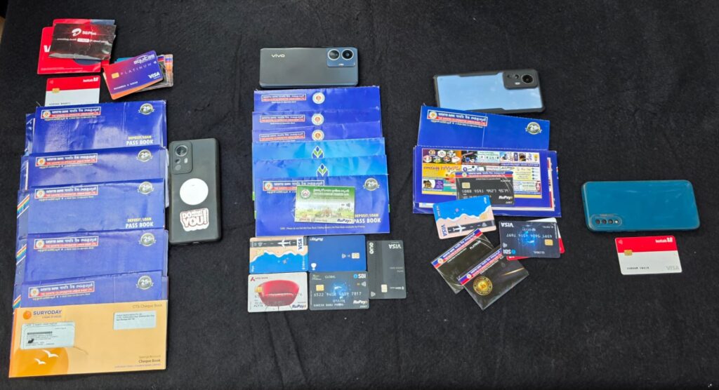 तलाशी के दौरान आरोपियों के कब्जे से 13 बैंक पासबुक, 7 चेकबुक, 18 एटीएम कार्ड, 4 मोबाइल फोन, 12 सिम कार्ड और ₹5,700 नगद बरामद किए गए। समन्वय पोर्टल पर सत्यापन करने पर जब्त खातों में से कुछ खातों के संबंध में केरल, कर्नाटक, बिहार और गुजरात राज्यों में साइबर धोखाधड़ी की शिकायतें दर्ज पाई गईं।