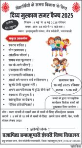वह बच्चों का मनोरंजन किया जाएगा। यह समर कैंप निशुल्क रखा गया है जिसमें बच्चों को योग, प्राणायाम, मेडिटेशन ,डांस, संगीत, भाषण, एवं चरित्र उत्थान नैतिक शिक्षा ,आदि सम्मिलित होंगे यह कार्यक्रम खास बच्चों की जीवन को उनके उज्जवल भविष्य को देखते हुए रखा गया है।