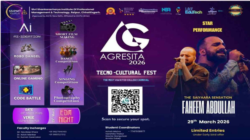 SSIPMT रायपुर में 28-29 मार्च को ‘अग्रसित’ टेक्नो-कल्चरल फेस्ट, एआई से लेकर डांस तक युवाओं का टैलेंट चमकेगा