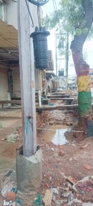 कहीं बरसात में इस खम्बे के पास से कहीं मिट्टी पानी मे बह गई तो खम्बे व ट्रांसफार्मर के गिरने की संभावना बढ़ जाएगी वही समीप ही लगे कपड़ा , जूता व फैंसी की दुकान है यदि दुर्भाग्य से कोई अनहोनी ह्यो गई तो भारी नुकसान इन दुकानों को विद्युत लाइन से हो सकता है । वही इसी के समीप पुराने खम्बो को नही हटाये जाने से सड़क डामरीकरण का कार्य भी रुक हुआ है ।
