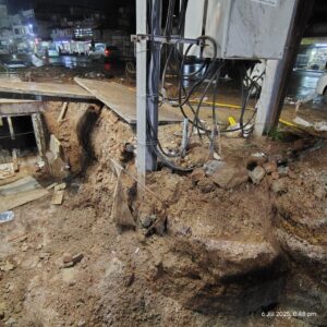 इसी तरह संचेती दुकान के सामने कुछ ही दिनों पूर्व नया खम्बा लगाकर ट्रांसफार्मर लगाया गया है । नाली निर्माण के लिए इसी खंबे से लगकर खुदाई कर दी गई है जिससे नीचे तक खम्बा स्पष्ट दिखाई दे रहा है । पिछले 2 दिनों से लगातार पानी गिरने से अभी निर्माण कार्य बन्द है ।