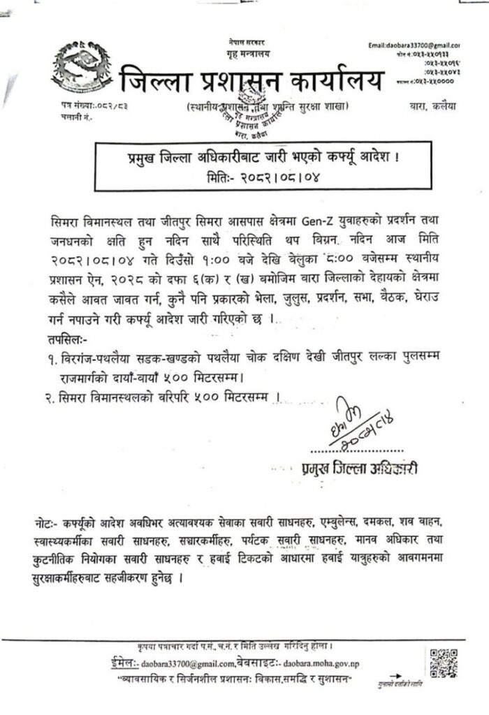 नेपाल के बारा जिले में ‘जेन-जी’ युवाओं और पूर्व प्रधानमंत्री केपी शर्मा ओली की पार्टी सीपीएन-यूएमएल के कार्यकर्ताओं के बीच हुई हिंसक झड़प के बाद बुधवार को प्रशासन ने कर्फ्यू लागू कर दिया। जिला प्रशासन के अनुसार, सिमरा हवाई अड्डे के 500 मीटर दायरे में दोपहर 12:30 बजे से रात 8 बजे तक कर्फ्यू प्रभावी रहेगा।