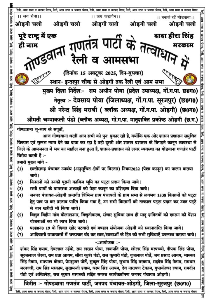 सूरजपुर। गोंडवाना गणतंत्र पार्टी के तत्वाधान में 15 अक्टूबर को एक बड़ी रैली और जनपद पंचायत ओड़गी का घेराव किया जाएगा। पार्टी ने इसे जन-आंदोलन का स्वरूप देते हुए कहा है कि अब “गोंडवाना धरती पुनः पुकार रही है” — क्योंकि एक ओर शासन-प्रशासन विकास और न्याय के बड़े-बड़े दावे कर रहा है, वहीं दूसरी ओर आम जनता भय और अव्यवस्था के माहौल में जी रही है।