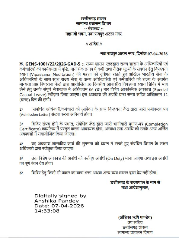 रायपुर: छत्तीसगढ़ सरकार ने शासकीय अधिकारियों और कर्मचारियों के मानसिक स्वास्थ्य एवं कार्यक्षमता में सुधार के लिए एक बड़ा निर्णय लिया है। अब राज्य के कर्मचारी विपश्यना ध्यान शिविर में शामिल होने के लिए विशेष आकस्मिक अवकाश का लाभ उठा सकेंगे। सामान्य प्रशासन विभाग ने इस संबंध में आधिकारिक आदेश जारी कर दिया है।