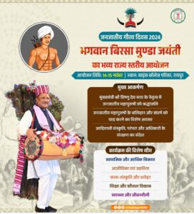 छत्तीसगढ़ की राजधानी रायपुर के साइंस कॉलेज मैदान में 14 एवं 15 नवंबर को भगवान बिरसा मुंडा की जयंती-जनजातीय गौरव दिवस पर राज्य स्तरीय भव्य आयोजन किया जायेगा। दो दिवसीय आयोजित इस कार्यक्रम में छत्तीसगढ़ सहित 17 राज्यों के आदिवासी कलाकार प्रस्तुतियां देंगे। इनमें अरूणाचल प्रदेश के आदि लोक नृत्य नाटिका, मध्यप्रदेश के भील भगोरिया नृत्य, मेघालय के गारो लोक नृत्य और नागालैण्ड के आओ नागा लोक नृत्य सहित विभिन्न आकर्षक प्रस्तुतियां होगी।