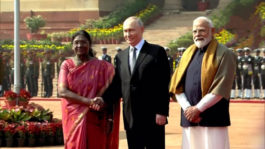 रूस के राष्ट्रपति व्लादिमीर पुतिन शुक्रवार, 5 दिसंबर को राष्ट्रपति भवन पहुँचे, जहां राष्ट्रपति द्रौपदी मुर्मू और प्रधानमंत्री नरेंद्र मोदी ने उनका स्वागत किया। राष्ट्रपति भवन में पुतिन को औपचारिक गार्ड ऑफ ऑनर दिया गया और 21 तोपों की सलामी के साथ सम्मानित किया गया।