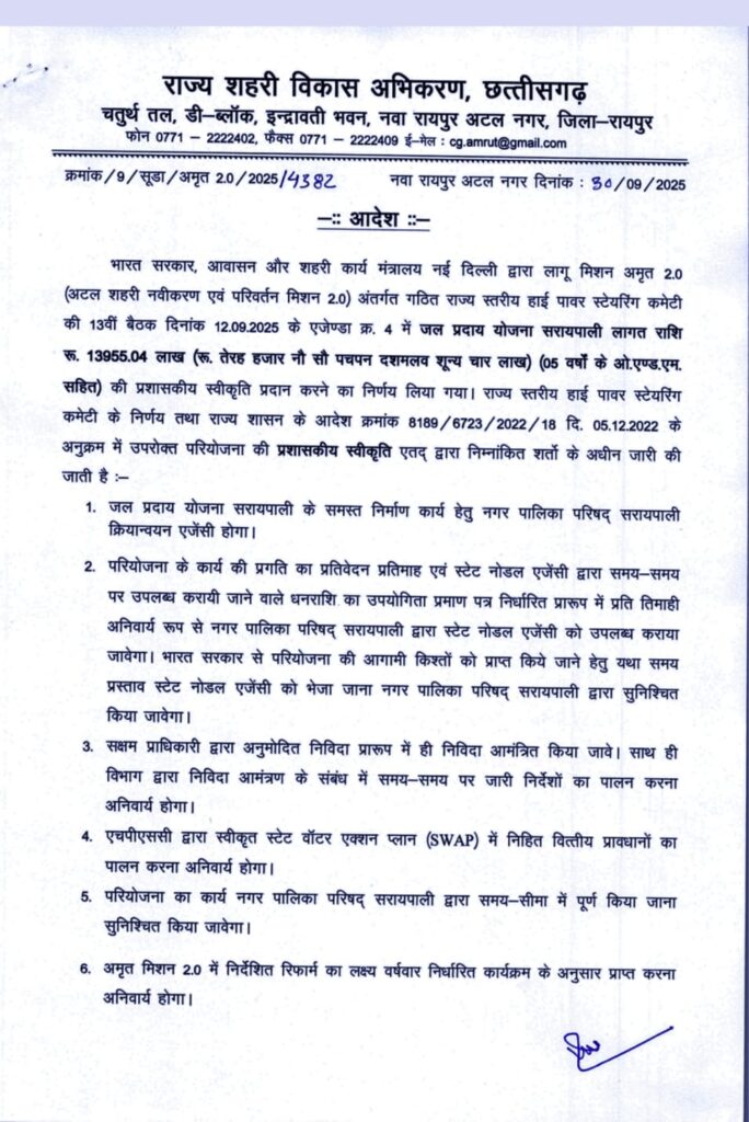राज्य शहरी विकास अभिकरण, छत्तीसगढ़ द्वारा जारी आदेश के अनुसार यह राशि सरायपाली नगर पालिका क्षेत्र के लिए तकनीकी रूप से स्वीकृत की गई है। इस स्वीकृति के साथ नगर के बुनियादी ढांचे को सुदृढ़ करने और जनसुविधाओं को उन्नत बनाने की दिशा में यह सबसे बड़ा कदम माना जायेगा ।