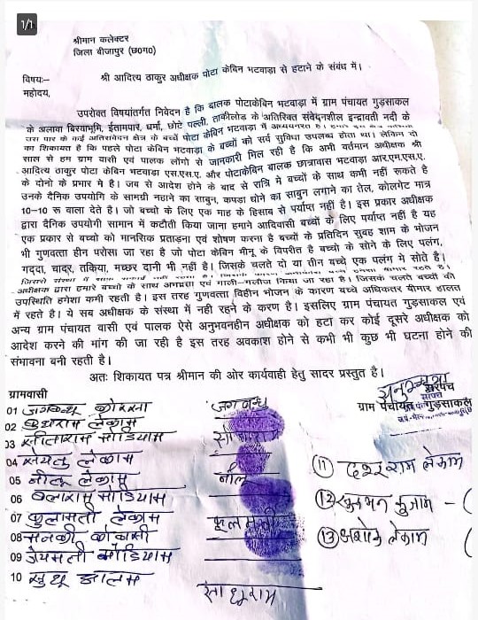 बीजापुर। भटवाड़ा स्थित पोटा केबिन बालक छात्रावास में गंभीर अव्यवस्थाओं और लापरवाही के आरोपों को लेकर गुडसाकल सहित भिरियाभूमि, ईतामपार, धर्मा, छोटे पल्ली और ताकीलोड ग्रामों के ग्रामीणों एवं पालकों ने कलेक्टर बीजापुर से वर्तमान अधीक्षक आदित्य ठाकुर को तत्काल हटाने की मांग की है।