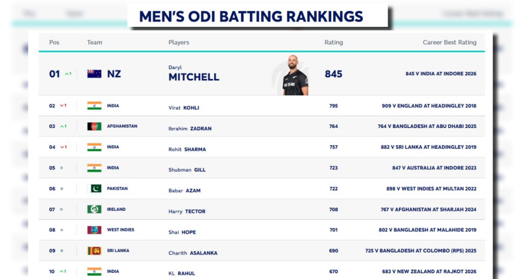 हालांकि, सिर्फ सात दिन बाद तस्वीर बदल गई। तीसरे वनडे में विराट के शतक के बावजूद भारत को हार का सामना करना पड़ा, वहीं डेरिल मिचेल ने लगातार दो बड़ी पारियों के दम पर पहला स्थान अपने नाम कर लिया।