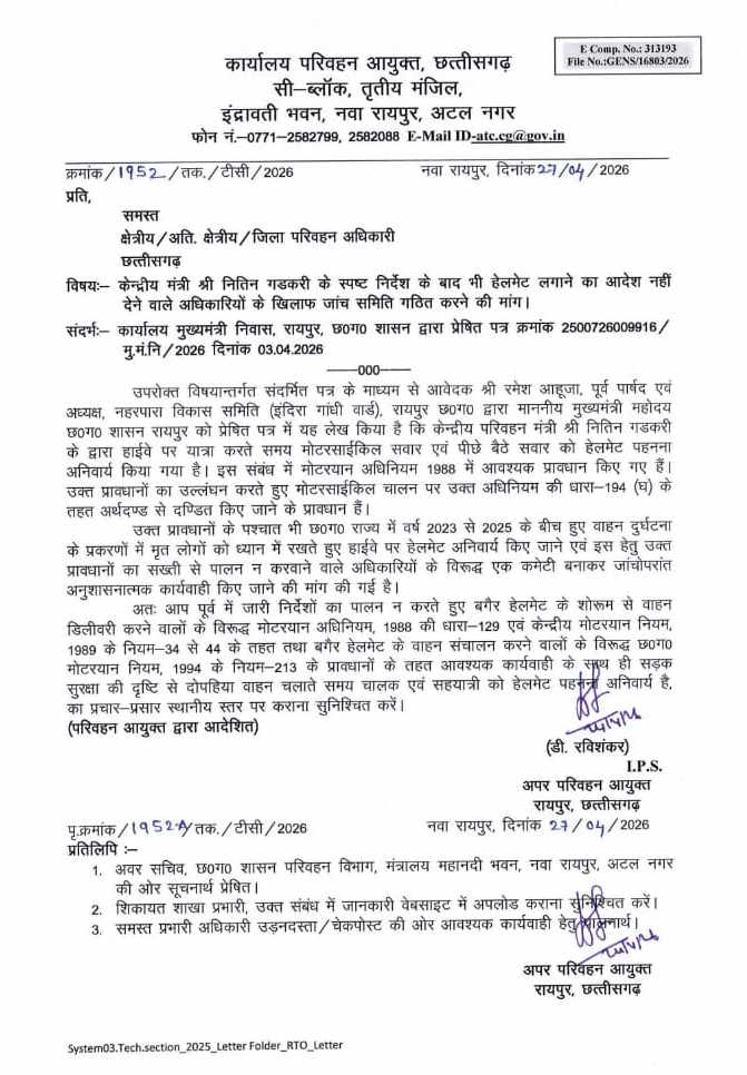 छत्तीसगढ़ में अब दोपहिया वाहन चालकों के साथ-साथ पीछे बैठने वाले सहयात्री के लिए भी हेलमेट पहनना अनिवार्य कर दिया गया है। अपर परिवहन आयुक्त डी रविशंकर ने प्रदेश के सभी क्षेत्रीय और जिला परिवहन अधिकारियों को पत्र जारी कर इस नियम का सख्ती से पालन सुनिश्चित करने के निर्देश दिए हैं। अब हाइवे पर यात्रा के दौरान केवल चालक ही नहीं बल्कि पीछे सवार व्यक्ति को भी सुरक्षा मानकों का पालन करना होगा वरना उन पर मोटरयान अधिनियम के तहत कड़ी कार्रवाई की जाएगी। विभाग ने स्पष्ट किया है कि सुरक्षा नियमों में किसी भी तरह की ढील बर्दाश्त नहीं की जाएगी और इसका व्यापक स्तर पर प्रचार-प्रसार शुरू कर दिया गया है।