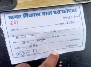 गरियाबंद।  जिले के नगर पंचायत कोपरा में रेत परिवहन के नाम पर खुलेआम अवैध उगाही की जा रही है। वाहन चालकों से ₹200 की राशि ‘नगर विकास दान पत्र’ नामक एक फर्जी रसीद के माध्यम से वसूली जा रही है, जबकि रेत खनन व परिवहन का पूरा अधिकार छत्तीसगढ़ शासन के खनिज विभाग के पास है। यह कार्यवाही न केवल नियमों के खिलाफ है, बल्कि सार्वजनिक संपदा की अवैध लूट का जीवंत उदाहरण है।