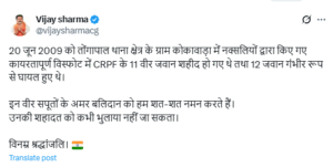 गृहमंत्री विजय शर्मा ने सोशल मीडिया जवानों को नमन करते हुए वीडियो पोस्ट किया. उन्होने लिखा कि-‘ 20 जून 2009 को तोंगापाल थाना क्षेत्र के ग्राम कोकावाड़ा में नक्सलियों द्वारा किए गए कायरतापूर्ण विस्फोट में CRPF के 11 वीर जवान शहीद हो गए थे तथा 12 जवान गंभीर रूप से घायल हुए थे। इन वीर सपूतों के अमर बलिदान को हम शत-शत नमन करते हैं। उनकी शहादत को कभी भुलाया नहीं जा सकता। विनम्र श्रद्धांजलि।