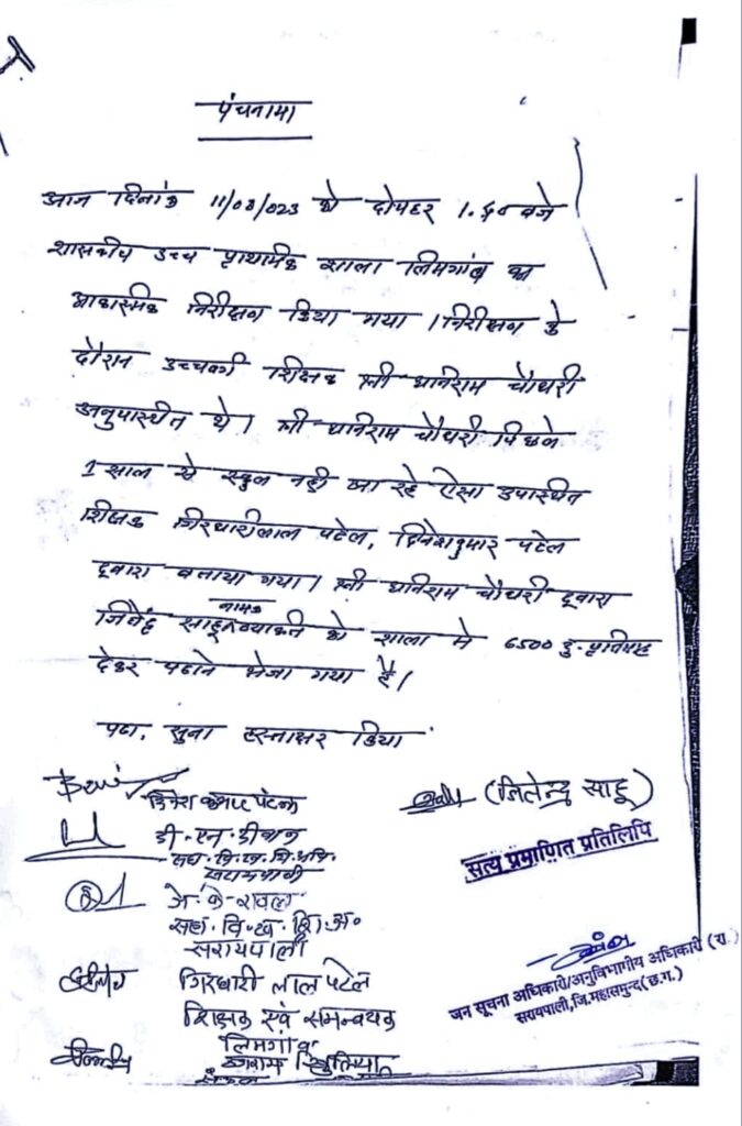 इस संबंध में जब लिमगांव के संकुल समन्वयक गिरधारी पटेल को बताया गया कि पंचनामा में आपने लिखित में स्वीकार किया है कि लकवाग्रस्त शिक्षक धनीराम चौधरी द्वारा जितेंद्र साहू को 6500/प्रतिमाह के तनख़ा पर पढ़ाने भेजा गया है पर उन्होंने कहा कि ऐसा कोई बयान मैने नहीं दिया है । शाला प्रबंधन समिति की तरफ से शिक्षा दान के तहत जितेंद्र साहू को निःशुल्क पढ़ाई के नाम से रखा गया था । किंतु इसके पक्ष में उन्होंने दस्तावेज इस संवाददाता को नहीं दिखाया गया ।