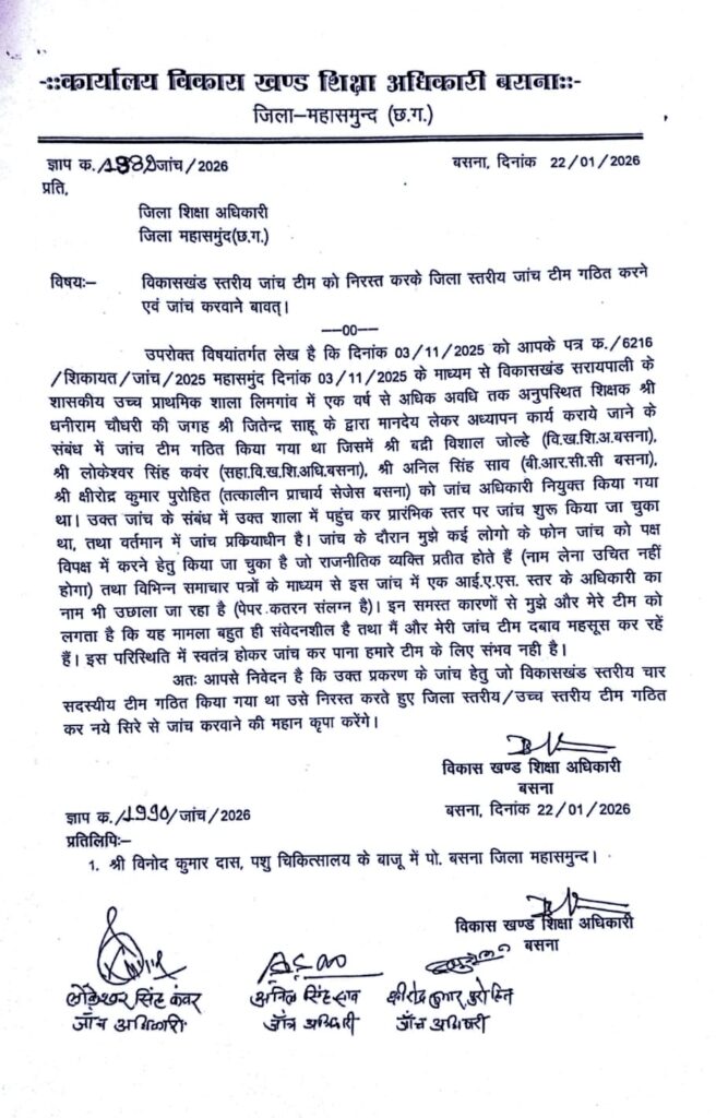 इस मामले में जांचकर्ता अधिकारी बद्रीविशाल जोल्हे (प्रभारी बीईओ बसना), लोकेश्वर सिंह कंवर (एबीइओ बसना), अनिल सिंह साव (प्रभारी बीआरसीसी बसना), क्षीरोद्र पुरोहित (प्राचार्य आत्मानंद स्कूल बसना) के द्वारा पत्र क्रमांक ज्ञाप/1990/जांच/ 2026दिनांक 22 /1/2026 को संयुक्त हस्ताक्षरित पत्र डीईओ महासमुन्द को भेजा। पत्र के अनुसार जांचकर्ता अधिकारियो को जांच के दौरान कई राजनीतिक व्यक्तियो के फोन करके जांच को पक्ष विपक्ष में मोडने का दबाब बनाया जा रहा है, आगे इन्होने बताया कि मिडिया में एक आइएएस स्तर के अधिकारी(तात्कालीन एसडीएम सरायपाली) का नाम भी उछाला गया है। मामला संवेदनशील है, जिस कारण जांच टीम दबाब महसूस कर रही है। ऐसी परिस्थति में स्वतंत्र रूप से जांच कर पाना संभव नही है।