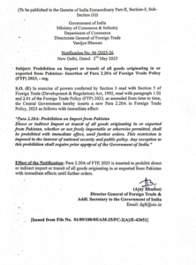 भारत सरकार ने पाकिस्तान से बढ़ते तनाव के बीच पाकिस्तान से सभी प्रकार के प्रत्यक्ष एवं अप्रत्यक्ष आयात पर तत्काल प्रभाव से प्रतिबंध लगा दिया है. यह फैसला विदेश व्यापार (विकास एवं विनियमन) अधिनियम, 1992** और विदेश व्यापार नीति 2023 के तहत लिया गया है।