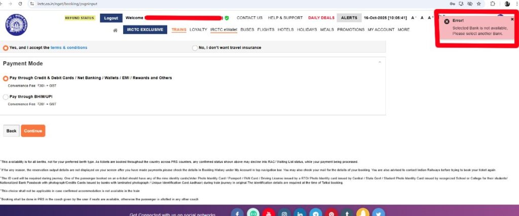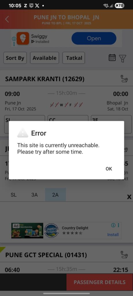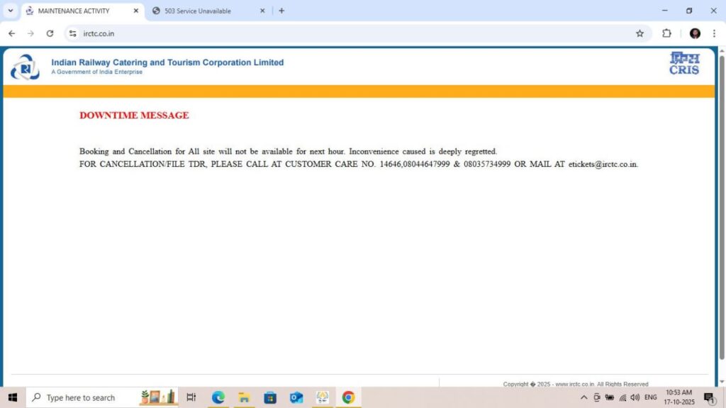 हर दिन सुबह 10 बजे एसी श्रेणी की और 11 बजे नॉन-एसी श्रेणी की तत्काल टिकट बुकिंग शुरू होती है। शुक्रवार को धनतेरस (शनिवार) के सफर के लिए टिकट बुकिंग खुलनी थी, लेकिन वेबसाइट डाउन होने से यात्रियों की उम्मीदों पर पानी फिर गया। त्योहार पर घर जाने की योजना बनाने वाले लोगों को बड़ी निराशा झेलनी पड़ी।