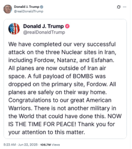 “हमने ईरान के तीन परमाणु ठिकानों – फोर्दो, नतांज और इस्फहान – पर सटीक हमला किया है। सभी विमान ईरानी हवाई क्षेत्र से बाहर हैं। फोर्दो साइट पर हमने पूरा बम पेलोड गिराया. हमारे बहादुर सैनिकों को बधाई. दुनिया में कोई और सेना ऐसा नहीं कर सकती। अब शांति का समय है”
