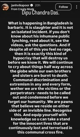 जान्हवी कपूर ने अपने आधिकारिक इंस्टाग्राम अकाउंट पर स्टोरी साझा करते हुए इस घटना को बर्बरता और नरसंहार करार दिया। उन्होंने लिखा कि बांग्लादेश में जो हो रहा है, वह अमानवीय है और यह कोई अकेली घटना नहीं है। यदि लोग इस सार्वजनिक लिंचिंग के बारे में नहीं जानते, तो उन्हें इसके बारे में पढ़ना, वीडियो देखना और सवाल पूछना चाहिए।