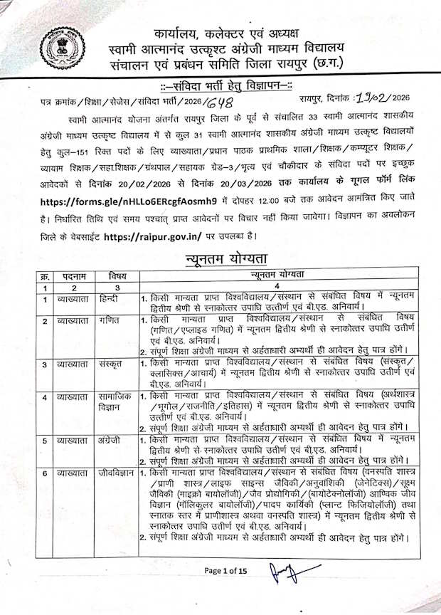 JOB NEWS: स्वामी आत्मानंद विद्यालय में 151 पदों पर भर्ती, 20 मार्च तक करें ऑनलाइन आवेदन