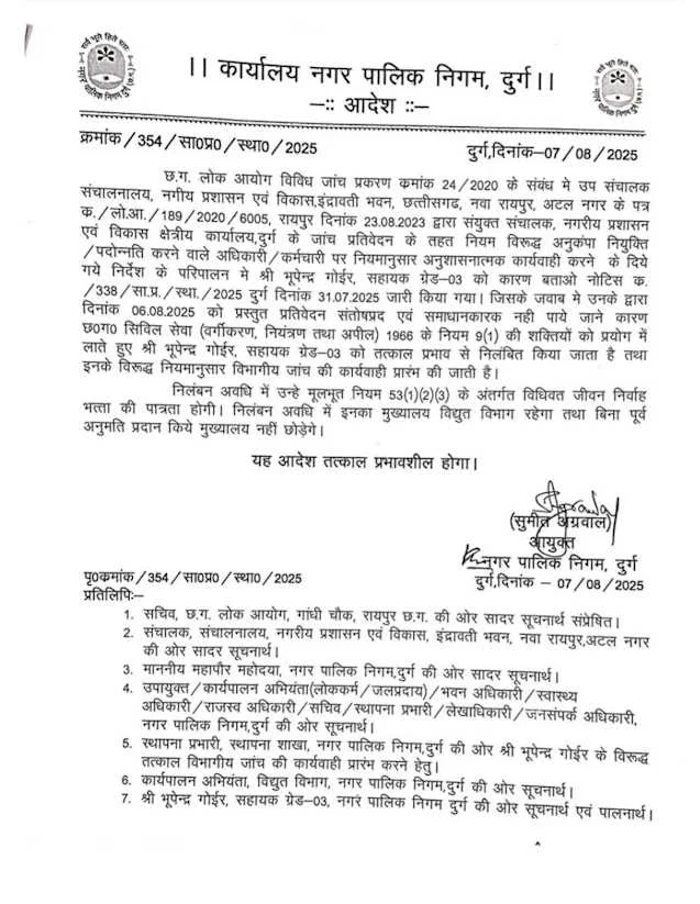 दुर्ग। नगर निगम दुर्ग में नियमों को दरकिनार कर की गई अनुकंपा नियुक्तियों पर अब प्रशासन सख्त हो गया है। इसी क्रम में निगम आयुक्त सुमित अग्रवाल ने सहायक ग्रेड-3 भूपेंद्र गोइर को निलंबित कर दिया है।
