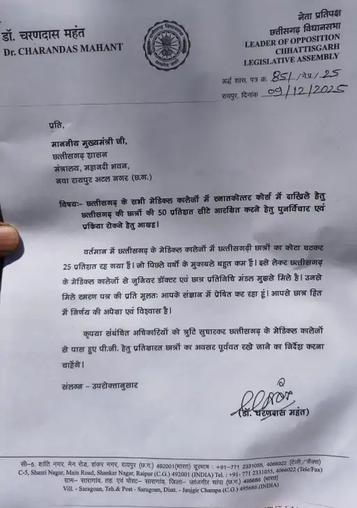 रायपुर। नेता प्रतिपक्ष चरणदास महंत ने मेडिकल पीजी सीटों में राज्य कोटा कम किए जाने के खिलाफ मुख्यमंत्री विष्णुदेव साय को पत्र लिखते हुए गंभीर चिंता जताई है। महंत ने मांग की है कि कम से कम 50 प्रतिशत मेडिकल पीजी सीटें छत्तीसगढ़ के छात्रों के लिए सुरक्षित रखी जाएं, ताकि स्थानीय छात्रों का भविष्य सुरक्षित बनाया जा सके।