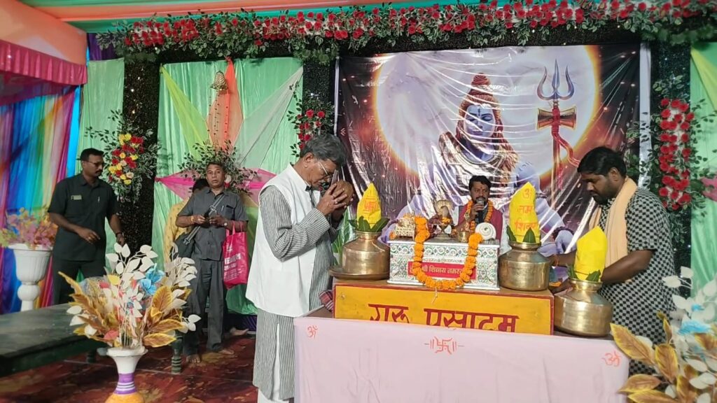 नेता प्रतिपक्ष डॉक्टर चरण दास महंत शिव कथा पुराण के प्रथम दिन कथा श्रवण करने नंदौर पहुंचे