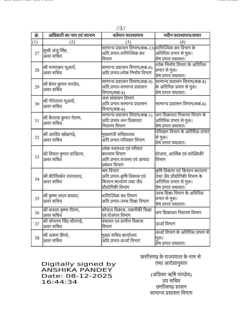 राज्य शासन ने सोमवार को प्रशासनिक स्तर पर एक बड़ा बदलाव करते हुए राज्य प्रशासनिक सेवा (रा.प्र.से.) के 38 अधिकारियों के विभागों में परिवर्तन किया है। सामान्य प्रशासन विभाग की उप सचिव अंशिका ऋषि पांडे ने राज्यपाल के नाम से यह आदेश जारी किया है.