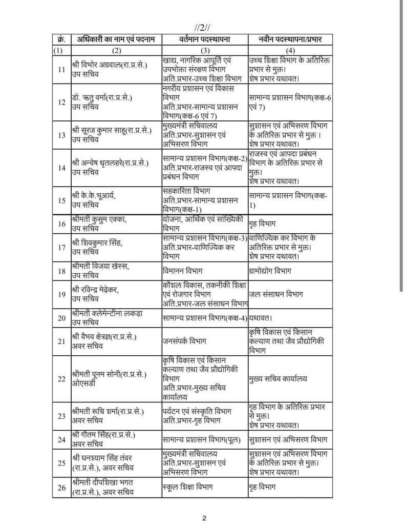 जारी सूची के अनुसार कई अधिकारियों को नए विभागों का प्रभार सौंपा गया है, जबकि कुछ अधिकारियों को उनके अतिरिक्त प्रभार से मुक्त करते हुए उनकी मौजूदा जिम्मेदारियाँ जस की तस रखी गई हैं।
