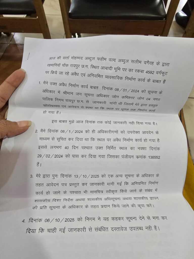 शिकायतकर्ताओं के अनुसार उन्होंने 08 जनवरी 2024 को सूचना के अधिकार (RTI) के तहत नगर निगम से अवैध निर्माण से संबंधित जानकारी मांगी थी, लेकिन उन्हें आज तक कोई जवाब नहीं मिला। आरोप यह भी है कि जबकि निर्माण भूतल तक पूरा हो चुका था, उसके बावजूद 29 फरवरी 2024 को भवन मानचित्र को स्वीकृति दे दी गई, जिसकी वैधता पर भी उन्होंने सवाल उठाए हैं।